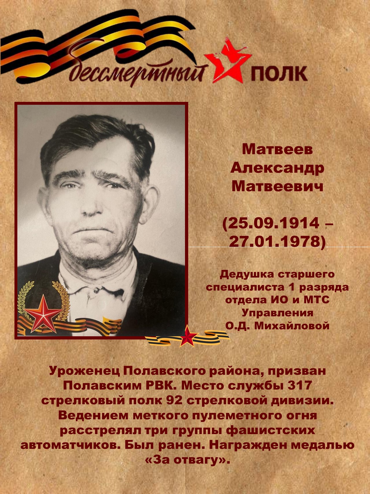 В честь 80-й годовщины Победы в Великой Отечественной войне Управление Судебного департамента в Новгородской области продолжает цикл публикаций "Бессмертный полк".